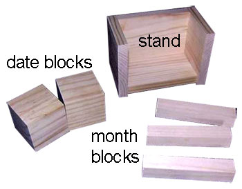 Label the month blocks in the same fashion as you labeled the day cubes. You will have three blocks with four surfaces each for you to write a month. Each surface measures 4" x ¾". A handy way to label these blocks is to use your computer to type up each month ensuring that they fit into a rectangle slightly smaller than the surface. Print them all onto 1 sheet of scrapbook paper, cut them out and stick them to the blocks with glue or double sided tape..